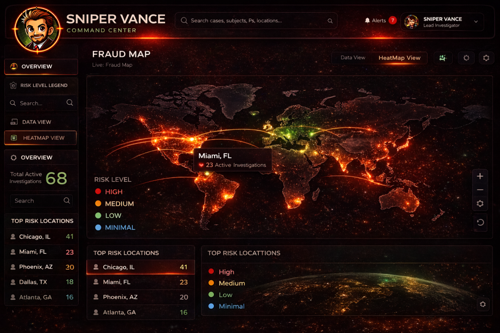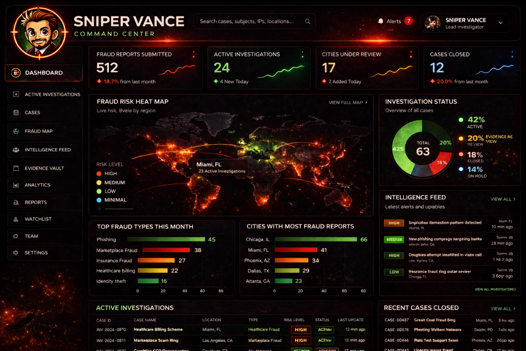 Sniper Vance is building a fraud investigation platform designed to expose fraud patterns, visualize hotspots, and activate a community-led intelligence network.